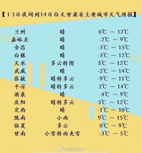 14日白天,甘南、陇南两州市及定西市南部、天水市南部多云转阴有小雪(雨),其中甘南州局部地方有中雪;省内其余地方多云或晴。另外,河西五市有4至5级西北风,阵风7级,局部地方有沙尘。