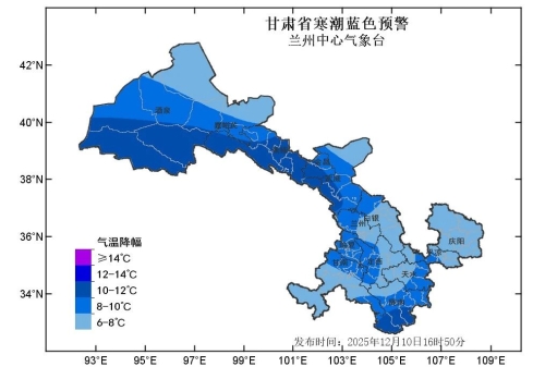 兰州中心气象台2025年12月10日发布寒潮蓝色预警:预计11日至13日清晨,全省大部自西向东最低气温下降6-8℃,其中河西五市、陇南等部分地方及陇中局部地方下降8~10℃,局地可达10℃以上,上述部分地方将出现寒潮。河西五市降温时段为11日白天至12日白天,省内其余地方降温时段为11日夜间至13日清晨。请注意防范!
