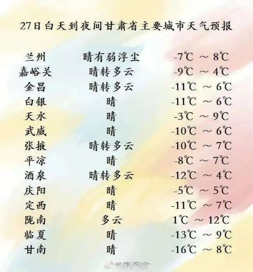 1月27日白天,全省各地晴或多云,甘南高原有4-5级偏西风。另外,白银、兰州两市部分地方及定西、天水、平凉、酒泉等市局部地方有浮尘。