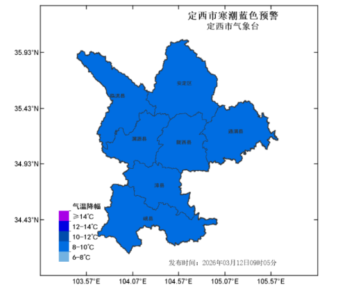 定西市气象台2026年03月12日09时05分发布寒潮蓝色预警:未来48小时,受强冷空气影响,全市大部气温下降8~10℃,出现寒潮,请注意防范。