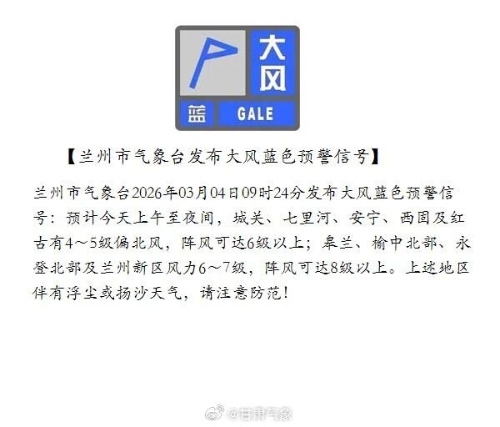 兰州市气象台2026年3月4日9时24分发布大风蓝色预警信号:预计今天上午至夜间,城关、七里河、安宁、西固及红古有4~5级偏北风,阵风可达6级以上;皋兰、榆中北部、永登北部及兰州新区风力6~7级,阵风可达8级以上。上述地区伴有浮尘或扬沙天气,请注意防范!